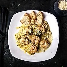Fettuccine pasta with sauteed shrimp in a traditional Alfredo sauce