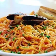 Spaghetti pasta on tomato sauce with mussels, clams, shrimp & scallops.