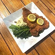 Tender File Mignon schnitzel, breaded and shallow fried, with choice of two sides.