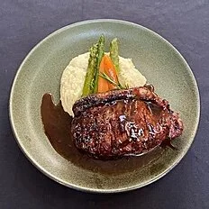 14oz Argentine NY Strip in a demi-glace sauce, served with girlled vegetables skewer & roasted potatoes