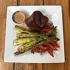 10oz Argentine Filet Mignon in a black pepper cognac sauce, served with grilled vegetables skewer & mashed potatoes