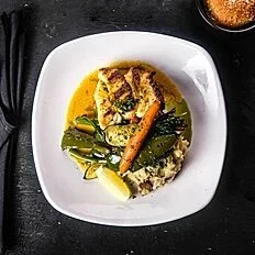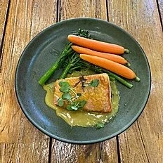 Grilled Salmon with a citrus-based sauce, served with your choice of two sides