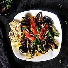 Mussels on our house curry & coconut milk sauce, served with a side of bread.