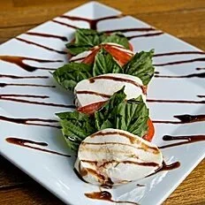 Sliced tomatoes, mozzarella, basil leaves & balsamic glaze.
