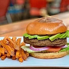 The Impossible 100% plant-based burger, on a brioche roll fresh avocado, lettuce, raw onions & tomato, served with sweet potatoes fries & chipotle mayo.
